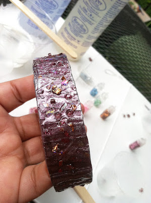All I did was use the mixing stick to spread some resin over the cured and painted bangle... then I thought it would be fun to add a few tiny glass beads and some nail colored foil pieces to add more color. The resin serves both as a sealer and glue – everything I added to this jewelry piece will never fall off. Resin is the best adhesive and I love using this on almost everything I create.